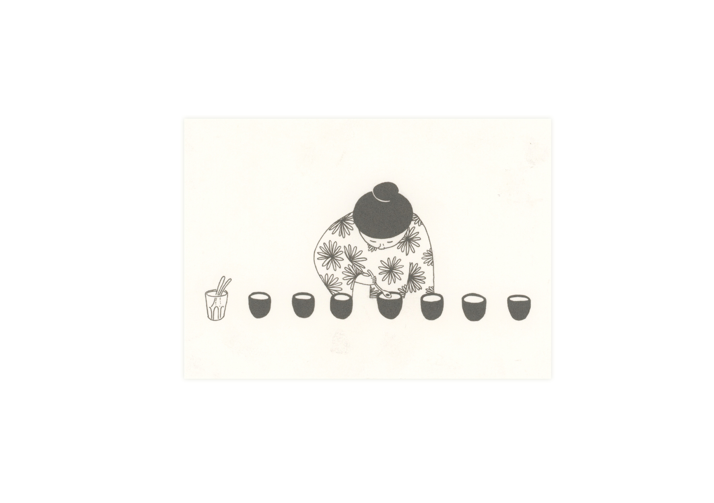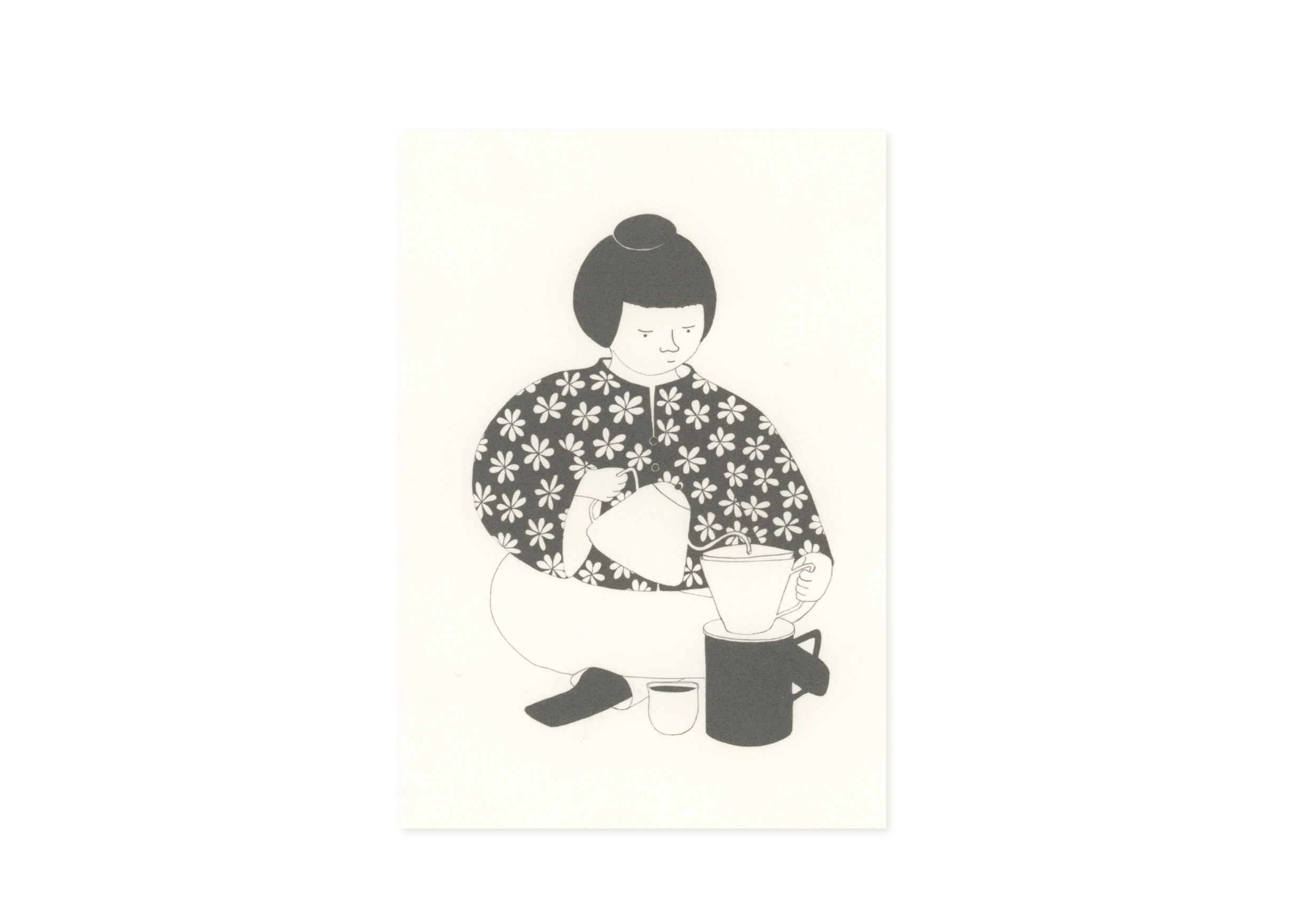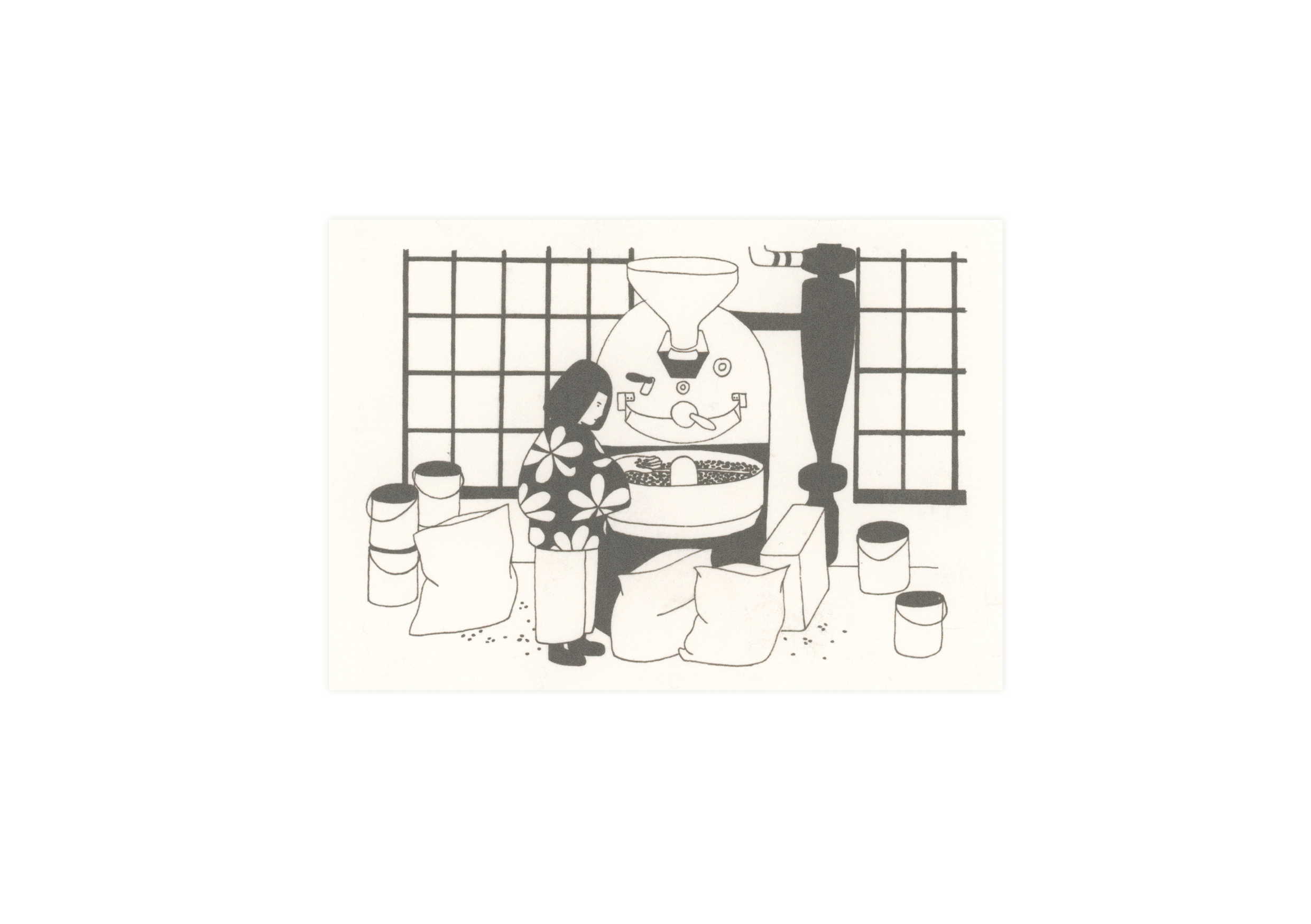 Postkarten für die Rösterei Heer. Die Illustrationen zeigen verschiedene Brühmethoden und den Prozess des Kaffeerösten und des Degustierens.