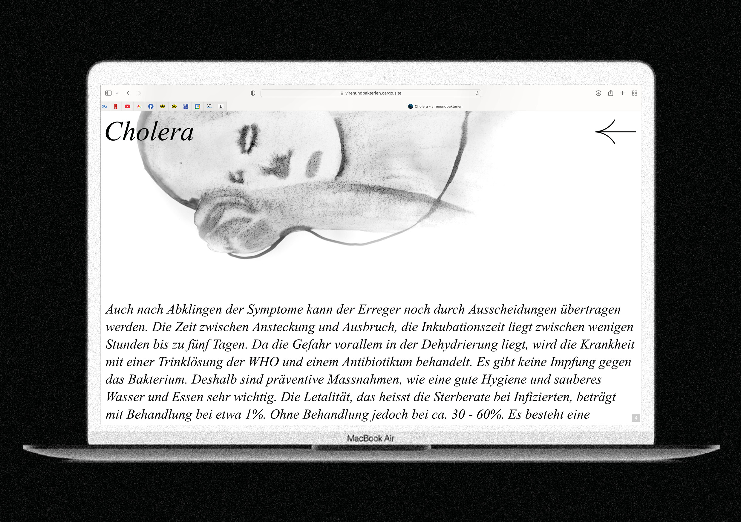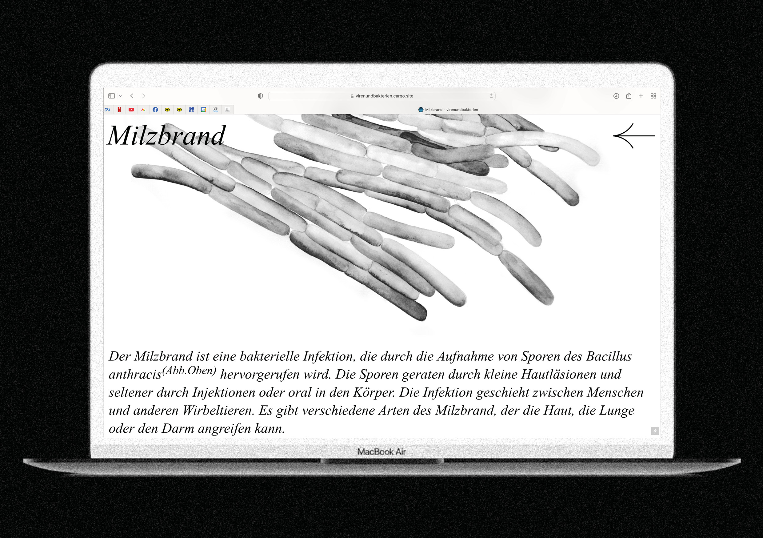 Digitale Bildgebungsverfahren stehen heute in einem gewissen Spannungsverhältnis zur klassischen wissenschaftlichen Zeichnung. Das Projekt Viren, Bakterien und der Mensch geht der Frage nach, welche Rolle die Zeichnung in der Biologie und Medizin heute in gewissen Kontexten einnehmen könnte. Die entstandenen Zeichnungen sind Resultat einer vertieften Erörterung der Frage nach Objektivität, Narration und Wissensvermittlung durch Zeichnung.Als Endprodukt dieser Auseinandersetzung steht eine Webseite, die einem Laienpublikum Einblick in die Welt der Bakterien und Viren geben soll. Diese schliesst sowohl wissenschaftliche Erkenntnis als auch Erzählung mit ein und zeigt damit, wie die Zeichnung unterschiedliche Bereiche eines Themas in einer einheitlichen Bildsprache visualisieren kann.